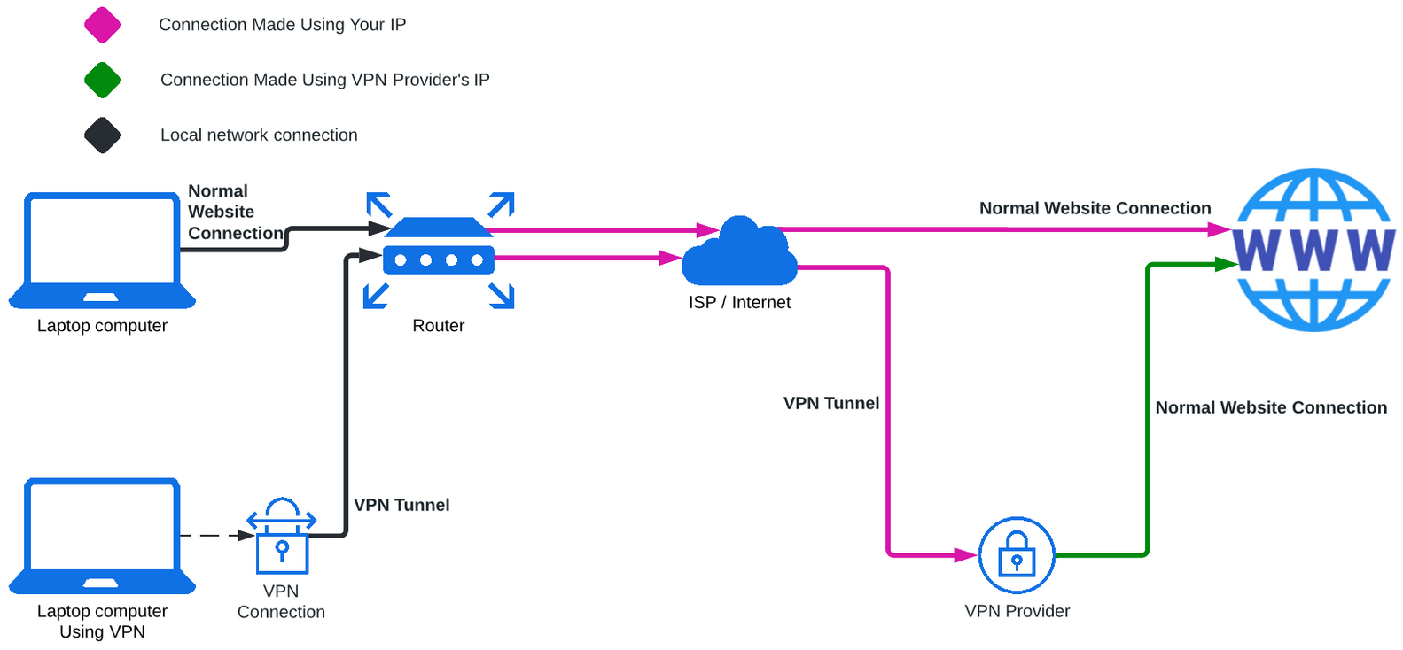 In order to demystify this further, here’s a simple network diagram using the example of a website connection. Two devices are shown on the same network connected to the same website. One is using a VPN service while the other is not. I have color coded the connection arrows based on IP address.