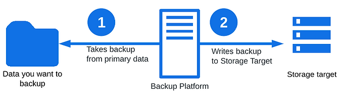 The Backup Platform will take a backup from your primary data, usually do some effort with de-duplication, encryption, and compression, and then write to a storage target (external hard drive, NAS, tape drive, cloud storage, etc).