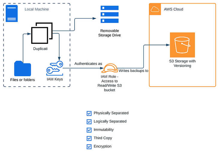 Here is the simplest example I could think of which checks all of the boxes (principles mentioned). Keep in mind, the “removable storage drive” should be physically disconnected, and connected only for the backup window to preserve the manual immutability. This drive can be kept on-site (even right next to your computer) since off-site backups are handled by the cloud. This example also assumes the S3 bucket is configured with compliance mode object lock to prevent deletion of versions.